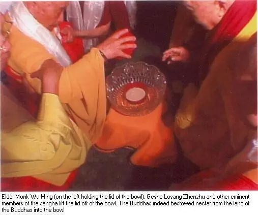 接着由悟明长老大和尚亲自在坛场中央洗甘露衣钵,其他仁波切和大法师们现场观看,果然天降虹光而下,佛陀于空中降下来甘露,在悟明长老洗净擦干的空衣钵内,出现了长寿佛所降的银灰色甘露,并且甘露还化成琼浆玉液,诸位大法师们当场亲口品尝,激动之情无言表述。